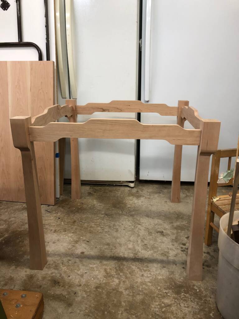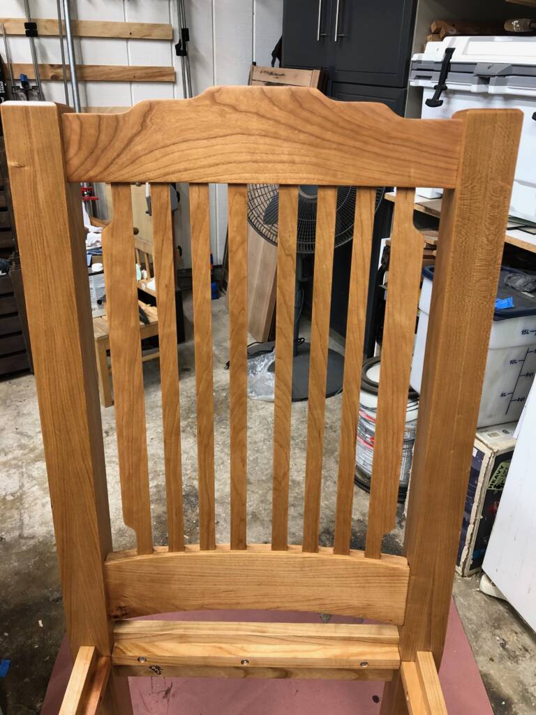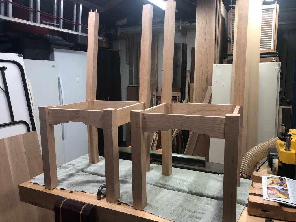 This mission-style dining set has elements inspired by Greene & Greene, the cloud lifts along the rails, and the curvy figure on the legs. I’m particularly fond of the grain patterns in this cherry. The slats in both chair backs are book-matched slices from the same section of board, and if you look closely you can see how the grain pattern radiates outward, mirroring each other. This was also my first time doing upholstery.
